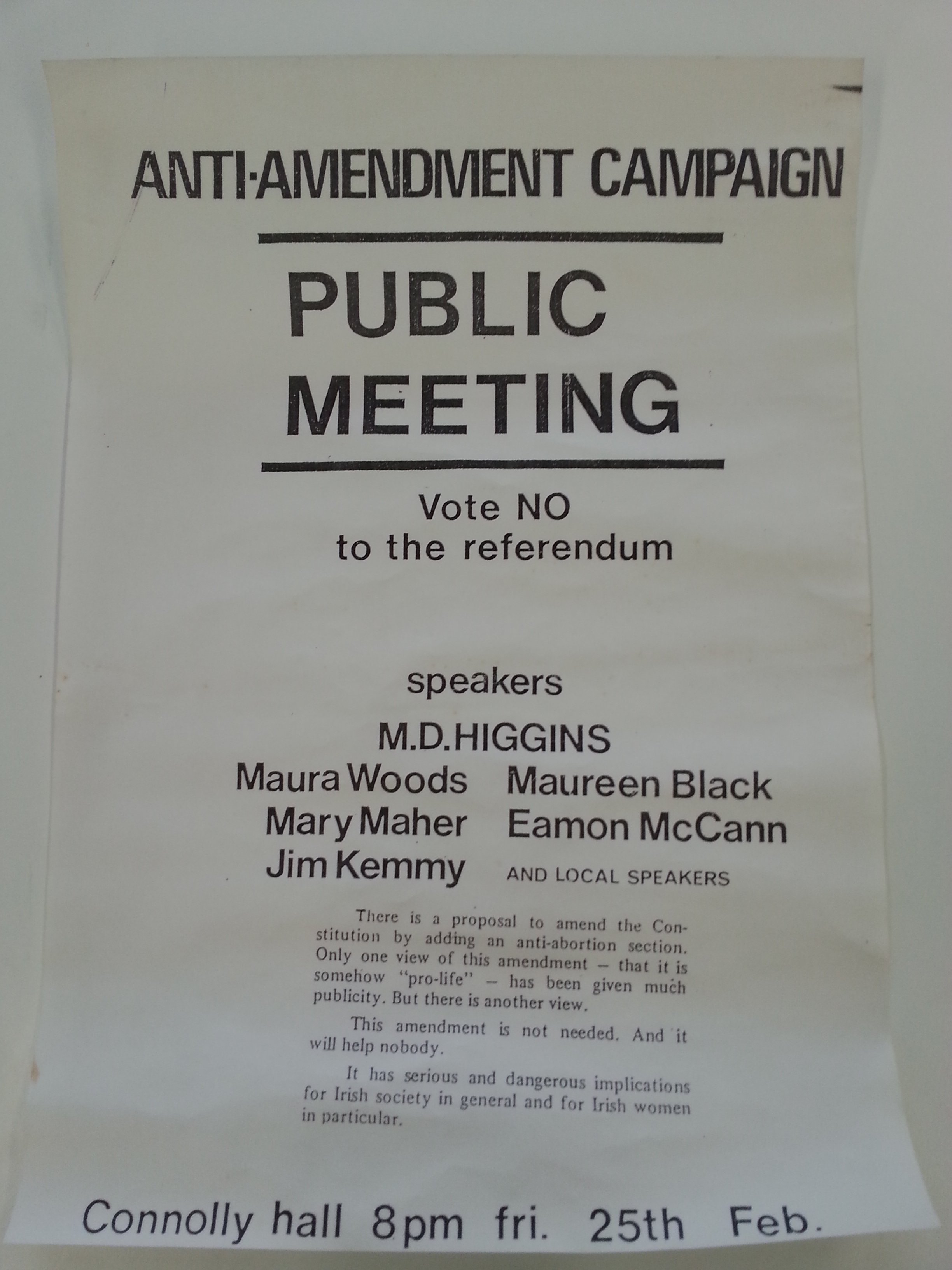 On 27th April 1981 a Pro-Life Amendment Campaign (PLAC) was launched with the aim of putting pressure on the Irish government to hold a referendum to insert an amendment to the Irish constitution guaranteeing the right to life of the foetus. Gradually opposition to PLAC emerged in feminist, socialist and liberal circles and Protestant church leaders began to voice their objections. Two conferences were held in December 1981 and March 1982 to discuss how to respond to PLAC. The conferences endorsed the establishment of a mixed (women and men) Women’s Right to Choose Campaign (WRCC) which would oppose PLAC from a pro-choice position. Others felt it was better to set up a broad-based alliance which would oppose the amendment but would not be openly pro-choice, In April 1982 an Anti-Amendment Campaign (AAC) was set up.