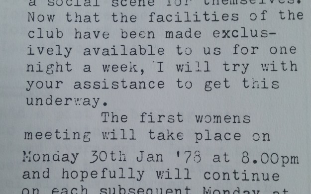 “Since the formation of the Cork Branch of the I.G.R.M. the gay women of this city have been considering setting up a social scene for themselves.  Now that the facilities of the club have been made exclusively available to us for one night a week, I will try with your assistance to get this underway.  The first womens meeting will take place on Monday 30th Jan ’78 at 8.00pm and hopefully will continue on each subsequent Monday at the same time.  Looking forward to your support.”  Marian Barry